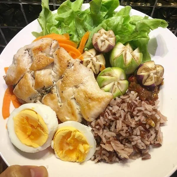 Cơm gạo lứt, ức gà, trứng gà, rau xà lách, cà rốt