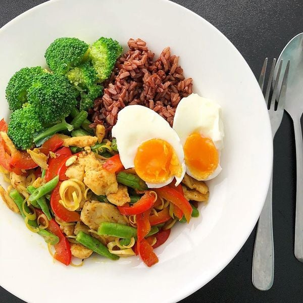 Cơm gạo lứt, ức gà xào ớt chuông, trứng gà, bông cải xanh