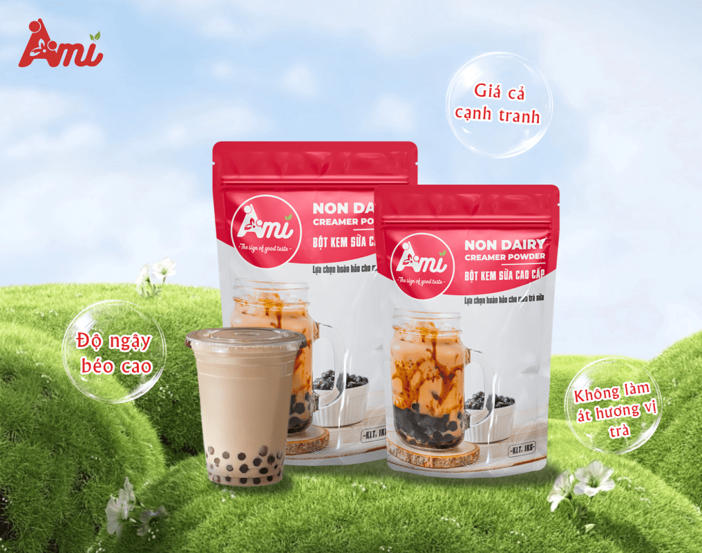 Bột kem sữa cao cấp hiệu AMI là bột kem béo với độ béo chính từ dầu cọ lên tới 35% được kết hợp cùng Protein thực vật giúp cho món thức uống trở nên đặc trưng hơn. Tuy nhiên, giá cả của bột sữa Ami lại phù hợp với túi tiền hơn rất nhiều.