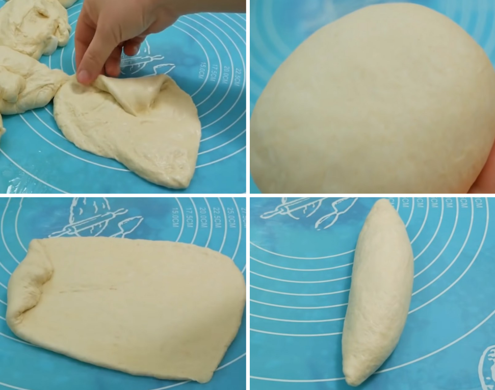 Đầu tiên bạn lấy một khối bột ra, dùng tay ấn bột xuống, đập nhẹ bề mặt bột để làm vỡ các bọt khí. Sau đó lần lượt gấp từng mép ngoài của bột vào trong, túm nhẹ các mép lại rồi vê tròn. Làm lần lượt như vậy đến khi hết các khối bột.