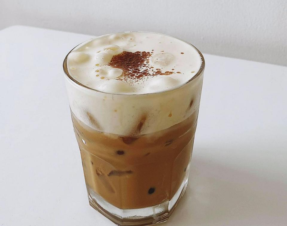 - Cho đá, rót cà phê lên để tạo tầng cà phê và sữa riêng biệt
